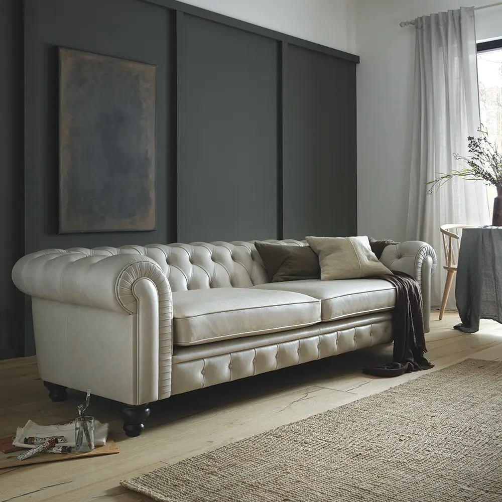 Bassa e raffinata, la Stamford si distende con naturale bellezza negli spazi ampi e luminosi. Lo schienale e i lati profondamente trapuntati si uniscono a una lavorazione plissettata unica che esalta i braccioli arrotolati, mentre la fila di bottoni frontali e i piedini torniti dal design moderno completano un look che è pura classe. Una dichiarazione di stile che dona carattere a ogni living.